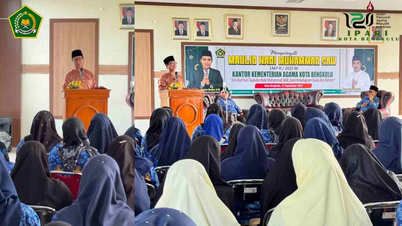 IPARI KOTA BENGKULU – Kementerian Agama (Kemenag) Kota Bengkulu, menggelar peringatan Maulid Nabi Muhammad SAW 1447 Hijriah/ 2025 Masehi, bertempat di Aula PLHUT Kemenag, Rabu (17/8/2025).