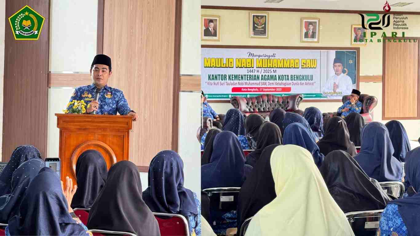 IPARI KOTA BENGKULU – Kementerian Agama (Kemenag) Kota Bengkulu, menggelar peringatan Maulid Nabi Muhammad SAW 1447 Hijriah/ 2025 Masehi, bertempat di Aula PLHUT Kemenag, Rabu (17/8/2025).